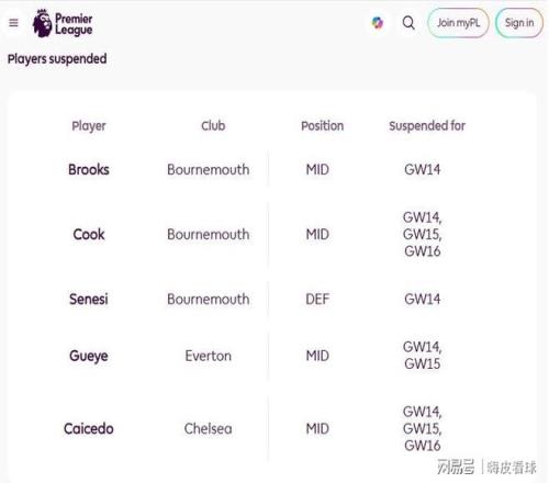 根据规则,累积5张黄牌需要停赛一场,10张就要停赛两场。因此,英超官方公布了因为红牌或者累积黄牌而停赛的球员,伯恩茅斯的库克和切尔西的凯塞多,因为红牌的原因,面临三场停赛的处罚。其中,库克将缺席埃弗顿、切尔西和曼联的比赛,凯塞多缺席利兹联、伯恩茅斯和埃弗顿的比赛。